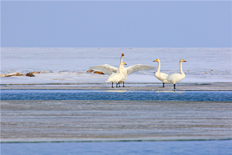 天鵝在結(jié)冰的湖面舒展翅膀。 郭輝忠 攝