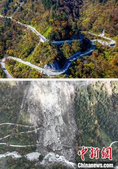 上圖為建成后的絕壁公路。下圖為地震后的絕壁公路受損情況。(拼圖)蜀道集團供圖
