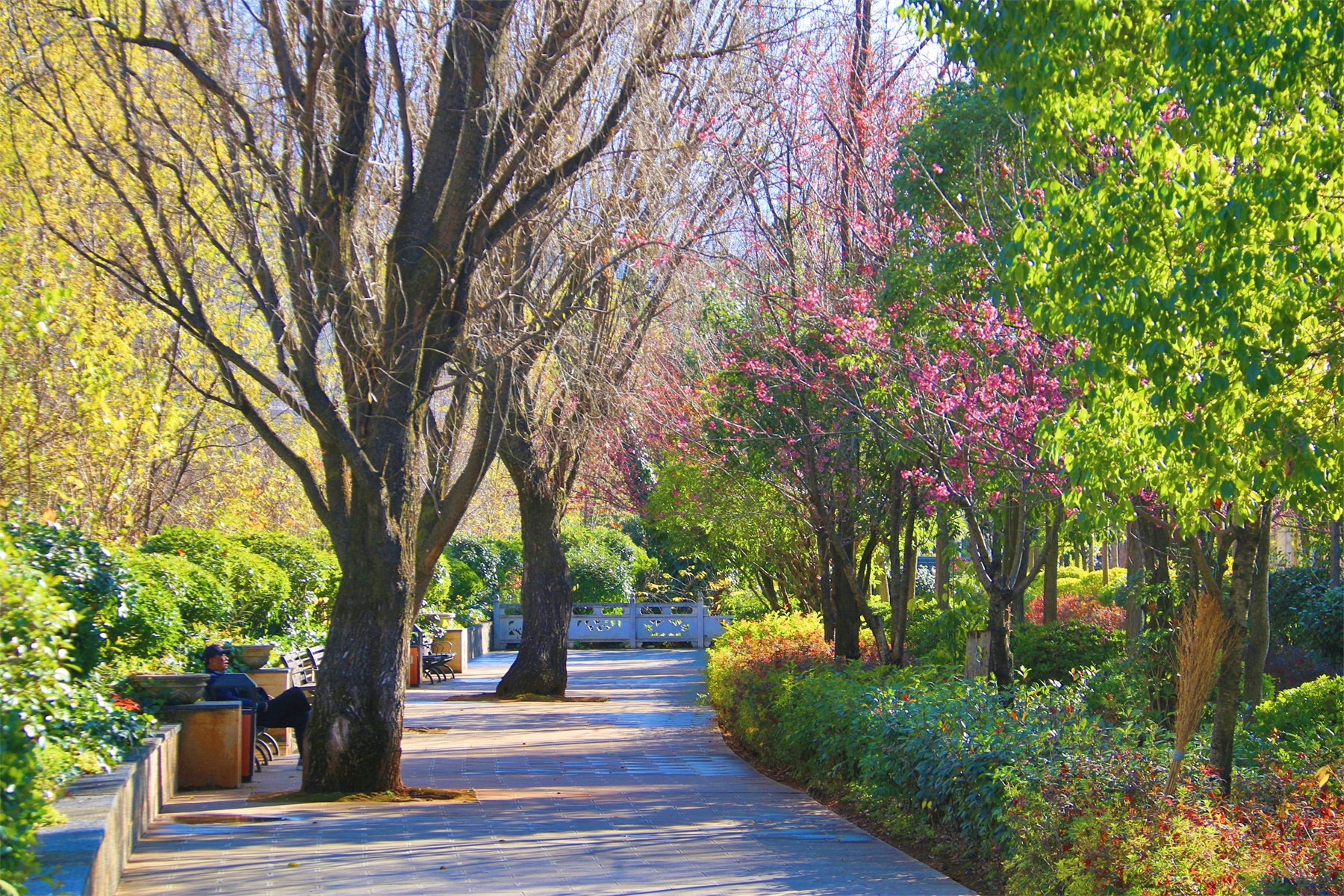 數(shù)九寒天,香格里拉產(chǎn)業(yè)園區(qū)卻是一幅暖冬畫面,陽光和煦,綠樹成蔭,沿江步道兩側(cè)的一樹樹冬櫻開滿粉紅的櫻花,蜜蜂穿梭期間,讓人仿佛置身春日。