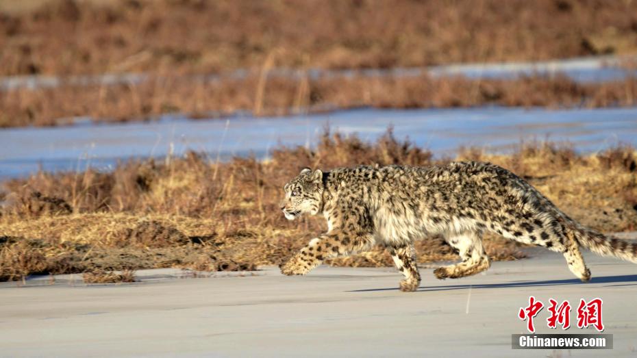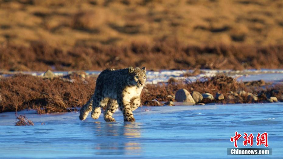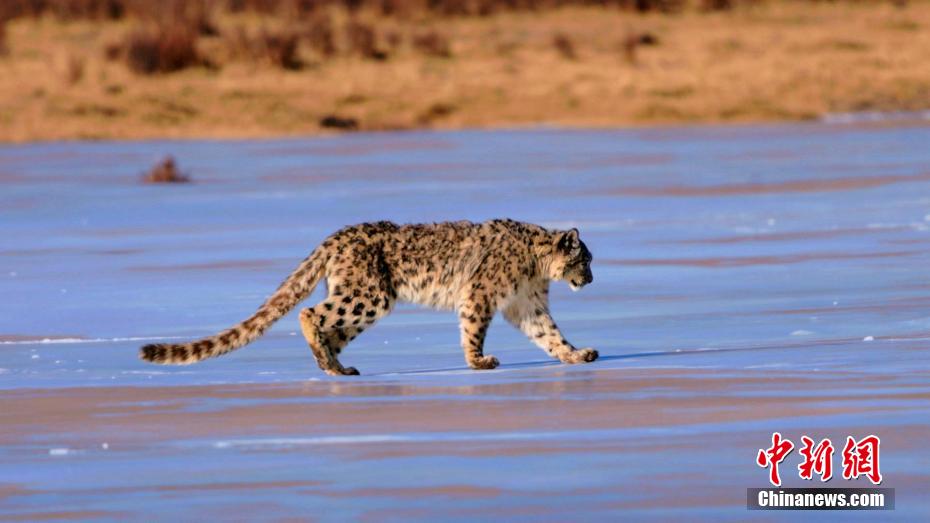 圖為雪豹在結冰的河面上行走。包雷 攝