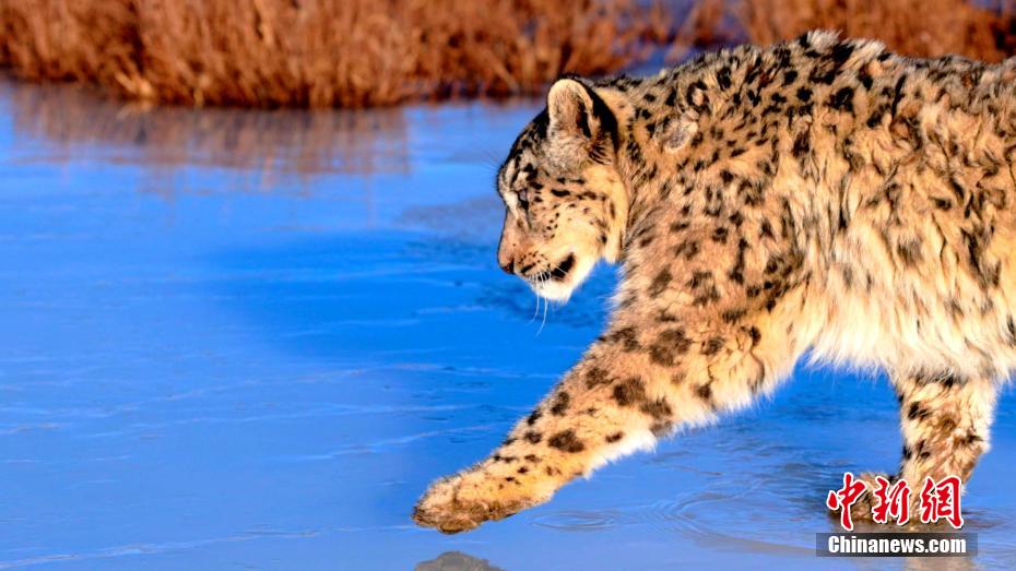 近日,祁連山國家公園簽約攝影師在青海省海北州祁連縣默勒鎮(zhèn)境內(nèi)的大通河畔,拍攝到一只雪豹在冰面上過河的場景。畫面中,雪豹匍匐著在草叢中穿行,到冰面時小心翼翼地試探了一下,發(fā)現(xiàn)沒有問題,從容地走在冰面上,每一幅畫面中“雪山之王”都霸氣外露。包雷 攝