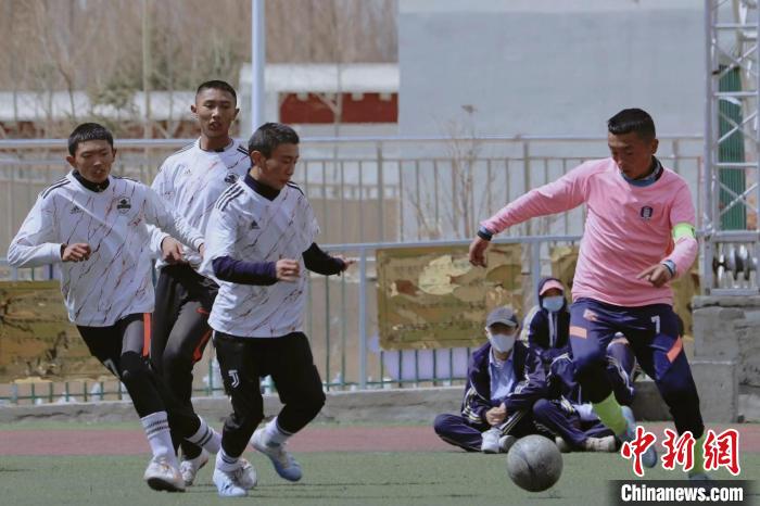 1月12日,孩子們?cè)谇嗪S駱淝槿R縣葉格鄉(xiāng)足球場上踢球(無人機(jī)照片)。新華社記者 韓方方 攝