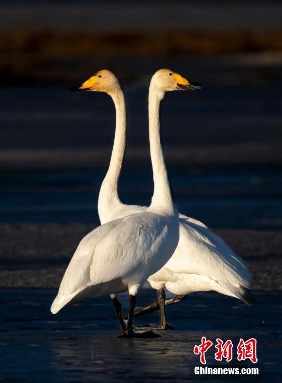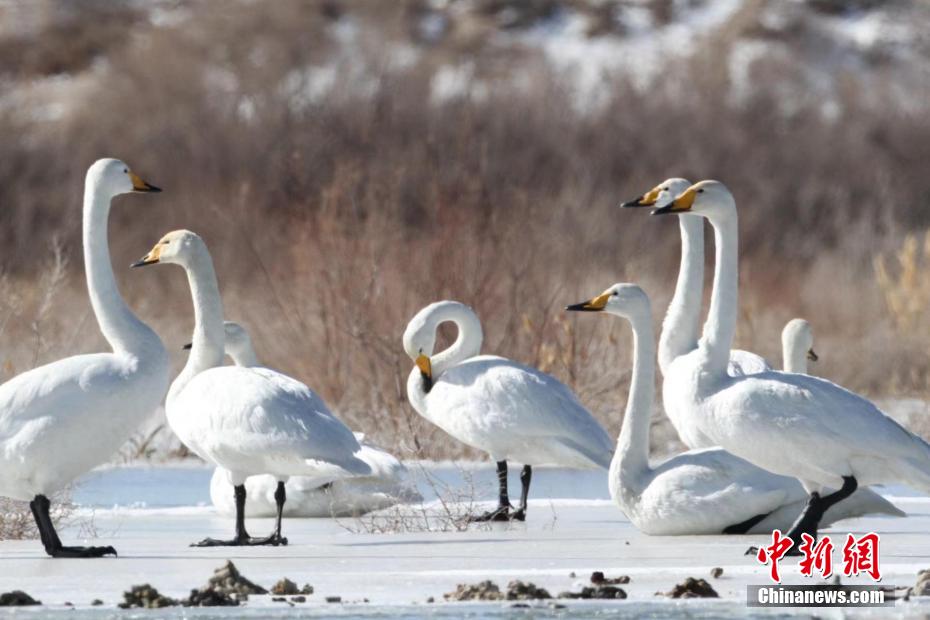 多只天鵝在湖冰上嬉戲。青??婶斂撕?托素湖省級(jí)自然保護(hù)區(qū) 供圖