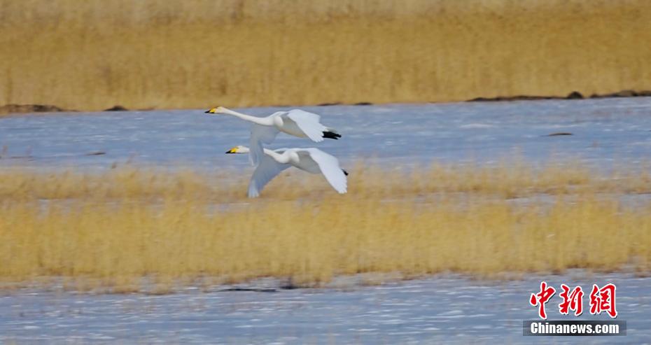 天鵝在空中飛翔。青??婶斂撕?托素湖省級(jí)自然保護(hù)區(qū) 供圖