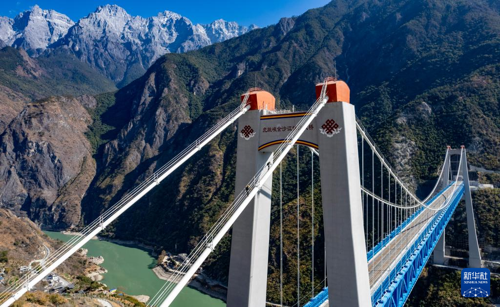 1月24日,列車通過虎跳峽金沙江鐵路大橋,遠處是玉龍雪山(無人機照片)。新華社記者 陳欣波 攝