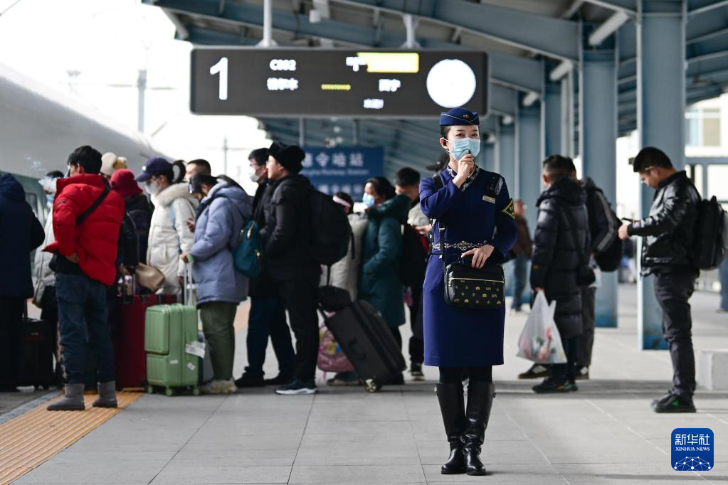 1月30日,中國(guó)鐵路青藏集團(tuán)有限公司西寧客運(yùn)段動(dòng)車隊(duì)乘務(wù)員王璐在站臺(tái)提示旅客登車。新華社記者 張龍 攝