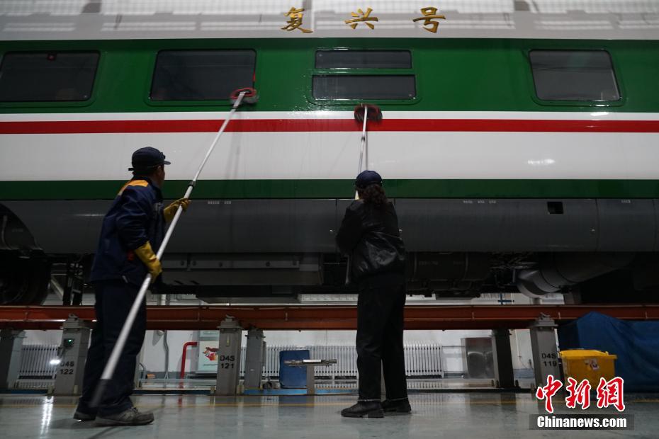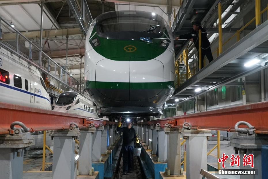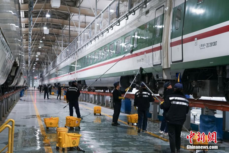 1月30日晚,在青藏鐵路公司西寧車輛段動(dòng)車運(yùn)用車間,工作人員在無(wú)電作業(yè)時(shí)進(jìn)行動(dòng)車清潔。中新社記者 馬銘言 攝