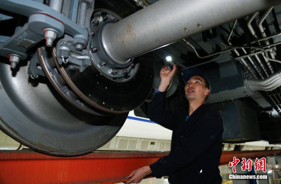 1月30日晚,在青藏鐵路公司西寧車輛段動(dòng)車運(yùn)用車間,地勤機(jī)械師在無(wú)電作業(yè)時(shí)進(jìn)行動(dòng)車組走行部關(guān)鍵部位的檢修。中新社記者 馬銘言 攝