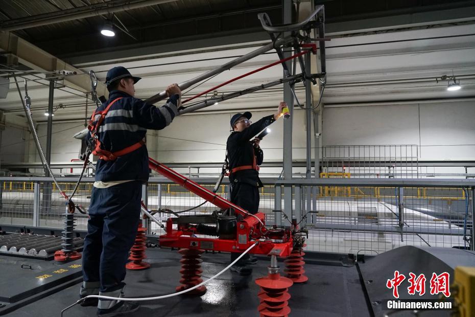 1月30日晚,在青藏鐵路公司西寧車輛段動(dòng)車運(yùn)用車間,地勤機(jī)械師在無(wú)電作業(yè)時(shí)進(jìn)行車頂受電弓的功能檢查及測(cè)漏檢測(cè)。中新社記者 馬銘言 攝