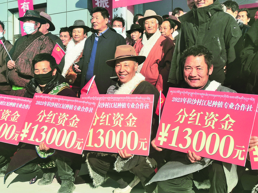 這是拉沙村江尼種植專業(yè)合作社的第三次分紅,也是分紅金額最大的一次。與村民一起將煙花爆竹放置在院落四周,村黨支部書記旦增尖措臉上寫滿了喜悅:“今天我們村又迎來(lái)了集體產(chǎn)業(yè)分紅,這次分紅84.5萬(wàn)元,社員平均1.3萬(wàn)元,大家切切實(shí)實(shí)享受了好政策帶來(lái)的紅利。”