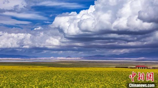 資料圖為航拍青海湖邊的萬(wàn)畝油菜田。海南州委宣傳部供圖