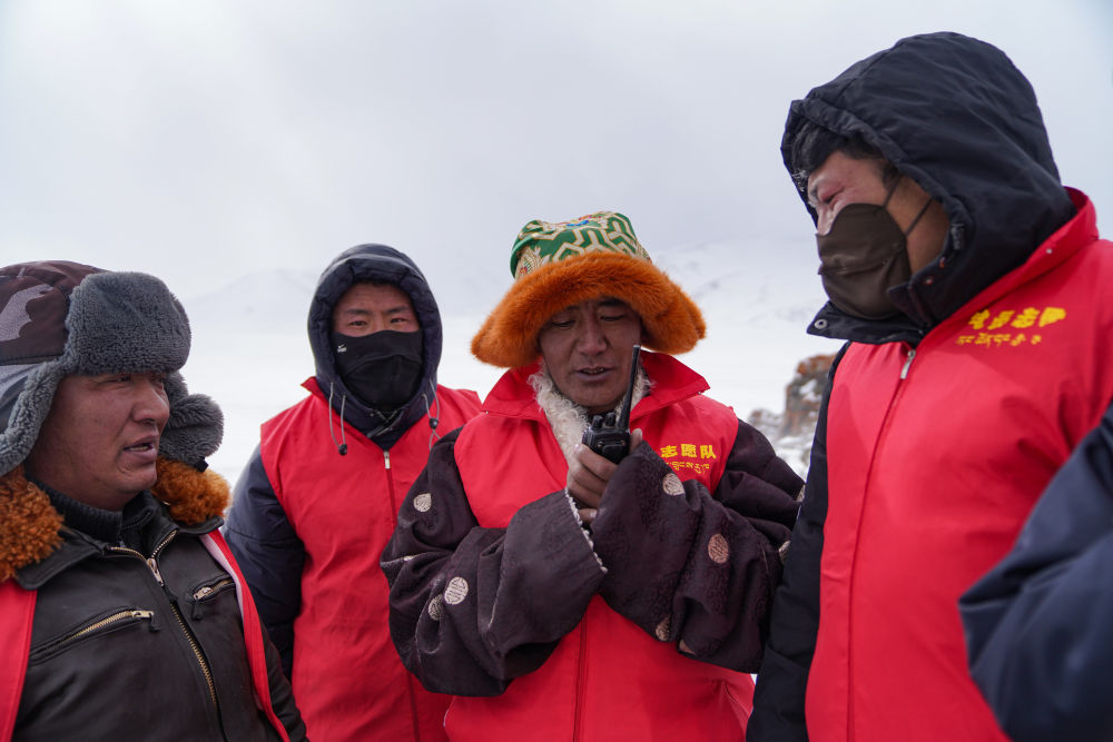 瑪曲鄉(xiāng)長江源黨員環(huán)保志愿隊(duì)隊(duì)員在巡邏時通過對講機(jī)互相聯(lián)系(2024年2月2日攝)。新華社記者 晉美多吉 攝