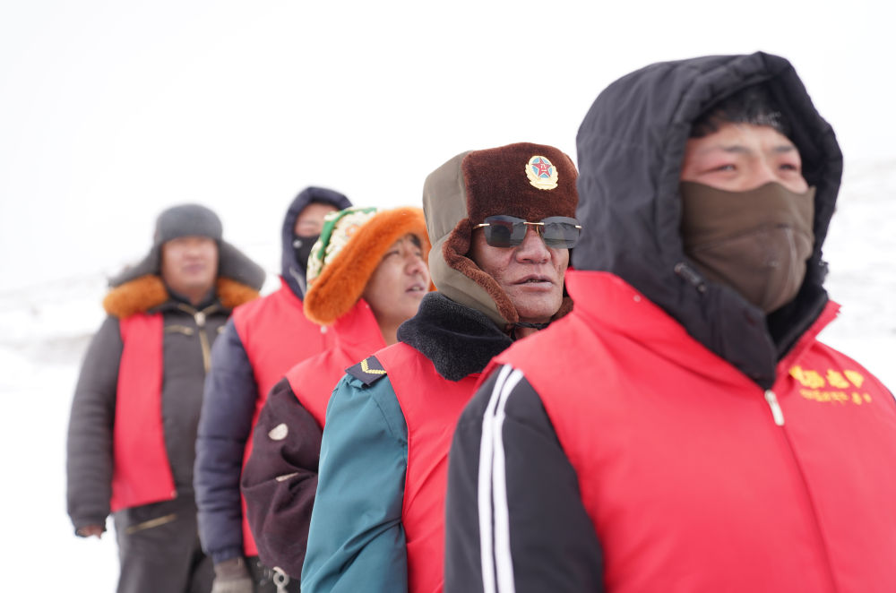 瑪曲鄉(xiāng)長江源黨員環(huán)保志愿隊(duì)年近七旬的才嘎老人(左二)在巡邏守護(hù)長江源(2024年2月2日攝)。新華社記者 晉美多吉 攝