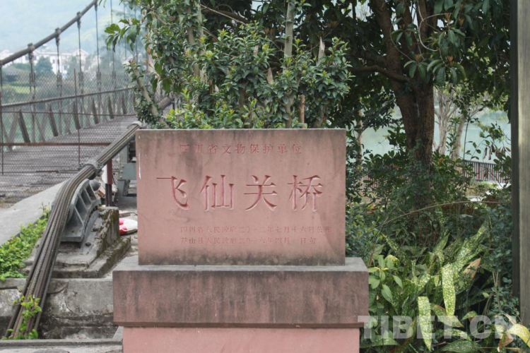 站在橋邊,遙望蜿蜒的江水就是青衣江,飛仙關(guān)橋全長164米,寬4.5米,索塔為鋼筋混凝土門式框架,高29米,流動式索鞍,策略式索錠,當時的設計載重為15噸。橋柱橫額上有時任西南軍政委員會主席劉伯承所題寫的橋名——“飛仙關(guān)橋”。橋西岸塔柱有時任十八軍政委譚冠三題寫的檻聯(lián)——“發(fā)揮天才,發(fā)揮力量,戰(zhàn)勝困難,創(chuàng)造人民幸福,一面進軍,一面建設解放西藏,鞏固西南國防”的字樣。東岸塔柱上有時任西康省主席廖志高題寫的檻聯(lián)——“勞動創(chuàng)造世界飛仙天險何難克服,革命帶來幸福閉塞邊區(qū)從此繁榮”字樣。橋上五顆閃閃的紅星,映照著飛仙關(guān)的繁榮,也印證著革命前輩們的美好愿景已經(jīng)變?yōu)楝F(xiàn)實。