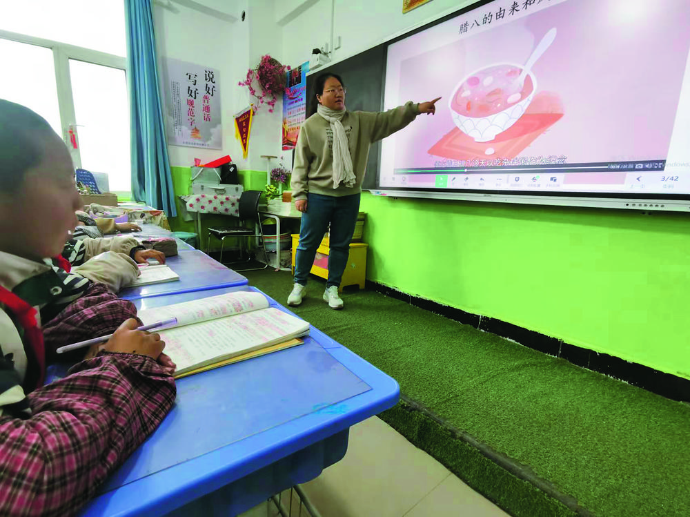 3月6日早晨,在青海省果洛州甘德縣民族寄宿制小學六年級五班的教室里,班主任老師解萌萌借著春節(jié)的余溫還未散盡,給孩子們講授著民俗文化和地域文化。在集聲、影、網(wǎng)以及遠程操作于一身的智能黑板上,播放著講解春節(jié)的由來和各地習俗的視頻,全班42名學生聚精會神地接受著傳統(tǒng)文化的熏陶。