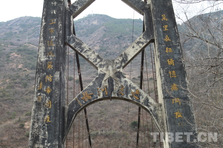 據(jù)了解,大渡河橋東西橋頭塔高分別為16米,孔徑132米,橋面4.5米,由27根直徑約3厘米大小的綱繩分布于左右兩側(cè),中間分別由45根同樣大小的鋼纜吊桿將橋身懸吊在大渡河上,橋身由無數(shù)鋼架鉚焊而成,鋼架之上鋪有約0.5米見方的方橙枕木,上鋪“人”字型拼木,允許載重量15噸。東西橋頭分別建有堅固的崗?fù)?,西橋頭正面豎有三道屏墻,左為原中國人民解放軍第十八軍軍長張國華,政委譚冠三撰寫的碑文,中間書有毛澤東同志七律《長征》詩手跡,右為建橋工程說明。