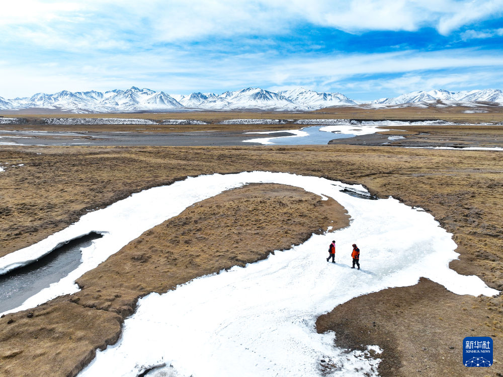 3月21日,葉金俄日(右)與東木措在青海省海北藏族自治州祁連縣的黑河流域巡護(hù)(無(wú)人機(jī)照片)。新華社記者 張龍 攝