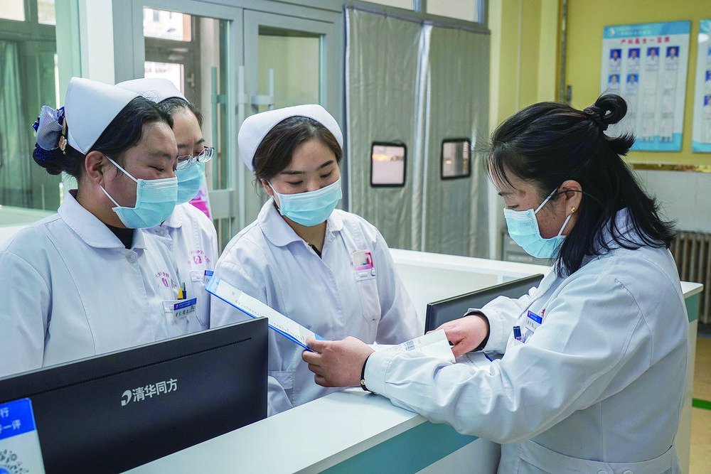 黃長珠(右一)與護士討論巡診情況。張得俊 攝