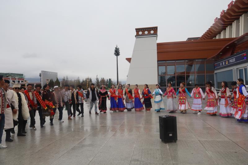 5月5日下午2點(diǎn)半,陰雨中的麗香鐵路香格里拉站,一曲曲歡快的傈僳族打跳,引來(lái)眾多游客和乘客駐足觀看,大家紛紛拍照合影,有的還加入學(xué)跳。