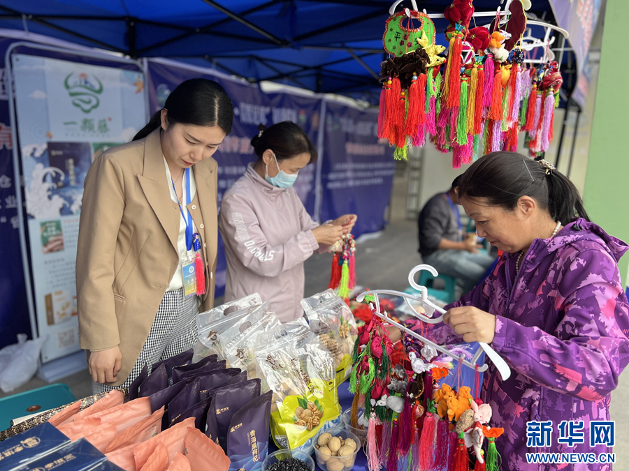 市民在賽場外非遺展示區(qū)挑選“青繡”掛件。新華網(wǎng) 魚昊 攝