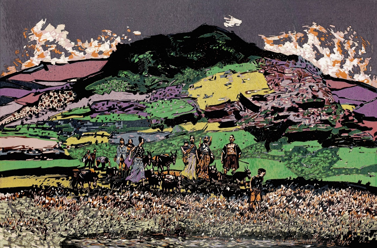 絕版木刻是一種木刻多色套印技法,它突破了傳統(tǒng)套色木刻“一色一版”的制作程序,將一幅畫所有的色版都集中在一塊版上,采用邊刻邊印逐版遞減的創(chuàng)作方式來(lái)完成,刻印版畫的過(guò)程也是自然毀版的過(guò)程,因而被稱為“絕版木刻”。