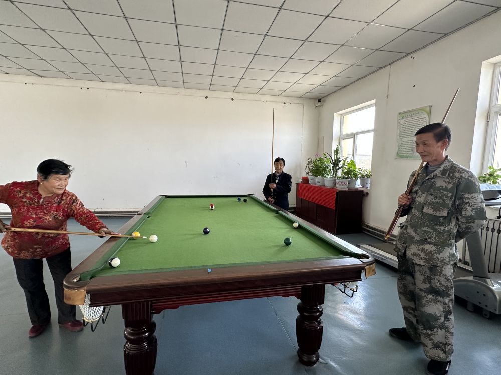 “在這兒吃住免費,飯有人做,衣服有人洗,每月還有100多元的養(yǎng)老金和零花錢?!痹诨顒邮依?,王金蓮手握臺球桿,熟練推桿。入住敬老院后,運動成了她的生活日常。