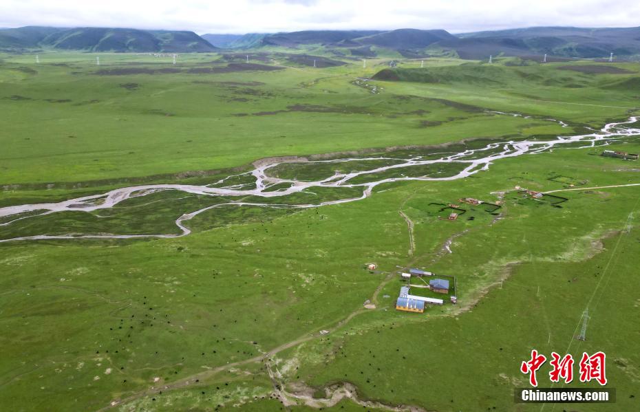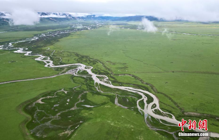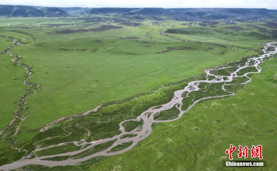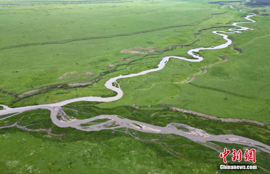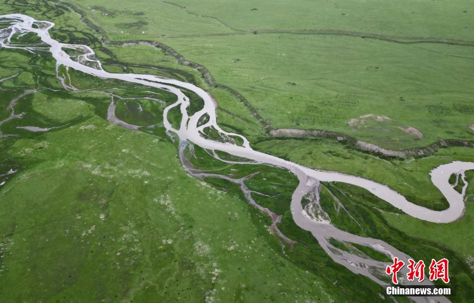 圖為6月26日,無(wú)量河蜿蜒在毛埡草原上。(無(wú)人機(jī)照片)中新社記者 王磊 攝
