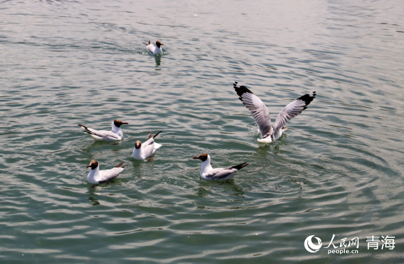 青海湖中嬉戲的水鳥(niǎo)。人民網(wǎng) 馬可欣 攝