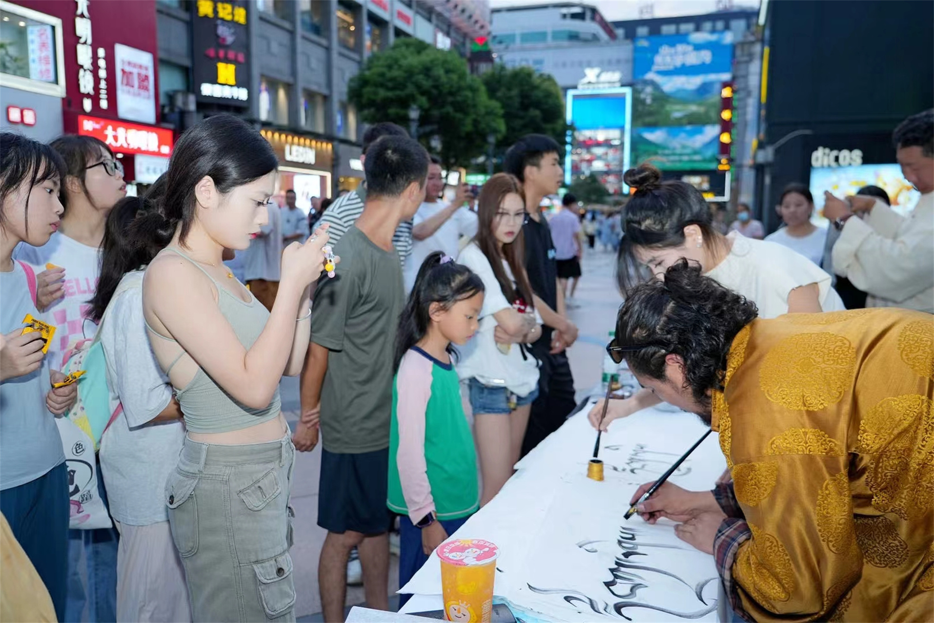 臨近傍晚,在春熙路“丹青繪盛景 筆墨頌祖國(guó)”藏文書法展演區(qū),兩位身著藏族傳統(tǒng)服飾的書法老師端坐于案幾之后,他們手持毛筆,蘸取特制的藏墨,在潔白的宣紙上揮灑自如,一筆一劃間流露出濃厚的藏族文化韻味。他們書寫的藏文內(nèi)容多為吉祥如意的祝福語,每一幅作品都蘊(yùn)含著對(duì)美好生活的向往和對(duì)遠(yuǎn)方來客的誠(chéng)摯歡迎。
