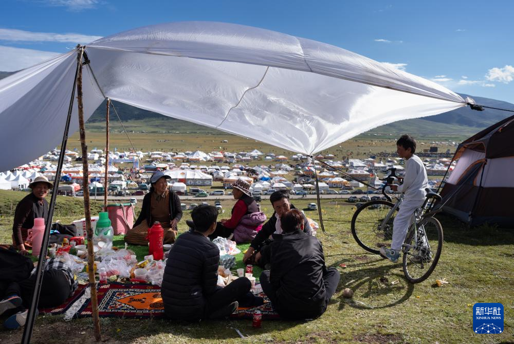 在四川省甘孜藏族自治州理塘縣多旺塘,人們?cè)诓菰现鹛炷豢救猓?月31日攝)。新華社記者 江宏景 攝