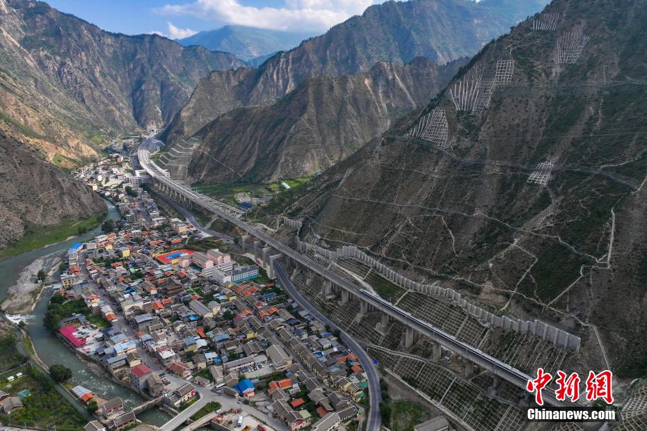 圖為川青鐵路鎮(zhèn)江關(guān)至黃勝關(guān)段松潘站全景。(無人機(jī)照片)中新社記者 劉忠俊 攝
