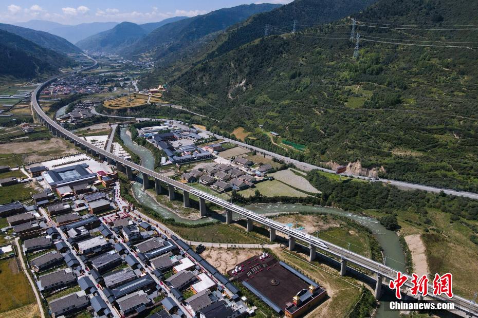 圖為一列動車組運行在川青鐵路黃龍九寨站至松潘站區(qū)間。(無人機(jī)照片)中新社記者 劉忠俊 攝