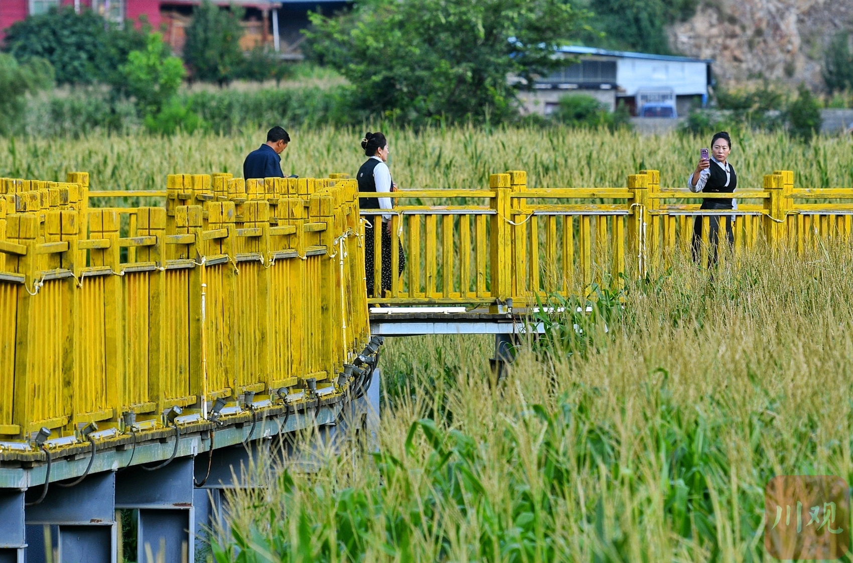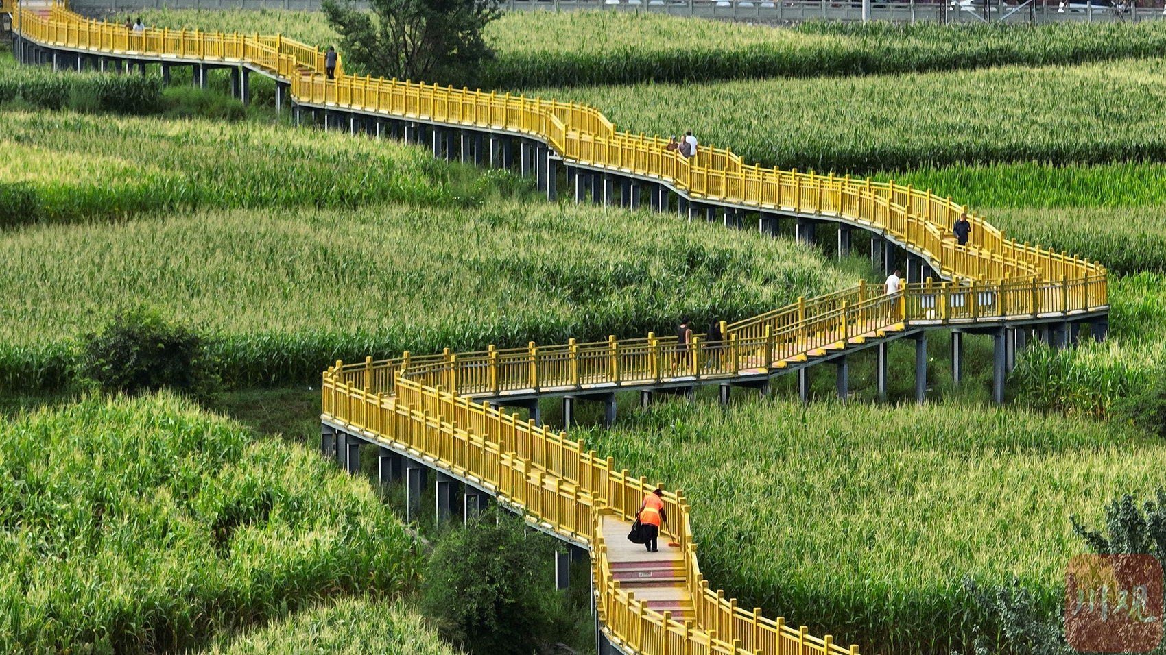 28日晨,記者從住地步行到縣城邊的“田園棧道”,只用了10分鐘。此時晨光中天色已泛藍(lán),田地里懸空架起的棧道,從郁郁蔥蔥的玉米田里一直曲折延伸,從空中俯瞰如同黃色哈達纏繞在翠綠田間,此景讓人眼前一亮。