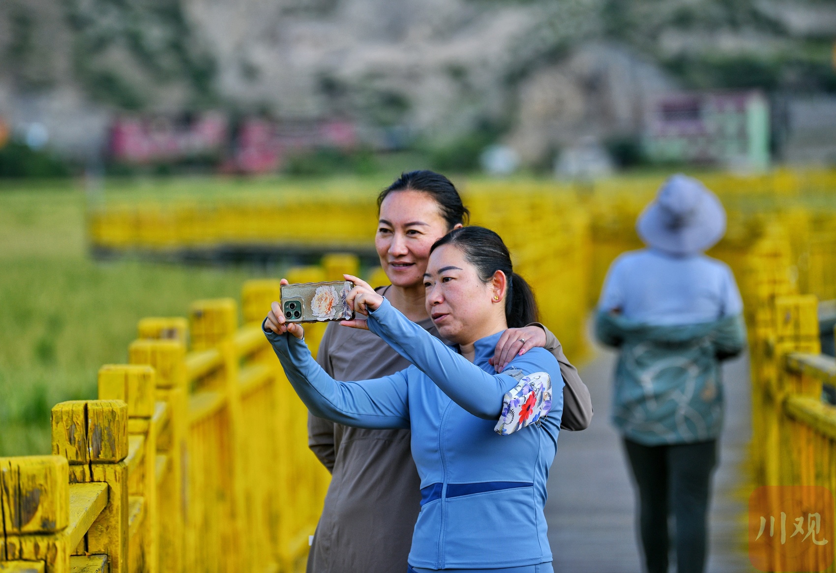 據(jù)了解,“田園棧道”是巴塘縣在農(nóng)旅結(jié)合、觀光農(nóng)業(yè)方面作為亮點打造的特色景點,現(xiàn)如今是網(wǎng)紅地,不少自駕游的旅行者都會慕名前來田園棧道打卡。吸引的不止是游客,當(dāng)?shù)鼐用褚蚕矚g早晚來這里漫步??吹接浾咴谂恼眨瑮5郎铣烤毜漠?dāng)?shù)厝诵χ垼骸斑@里漂亮吧,每天都有像您這樣的人拿著相機來拍照,拍完就走一圈,走棧道一圈只需要2500步?!?/p>