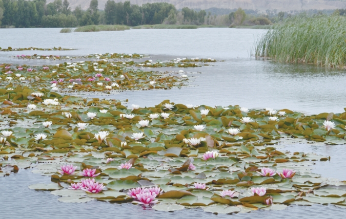 山坡上的泉眼里泉水汩汩而下,流經(jīng)之處綠草茵茵。東北角有個波光粼粼的小湖,幾只野鴨在悠閑地戲水,水珠飛濺泛著晶瑩的光,歡快的叫聲令人心曠神怡。