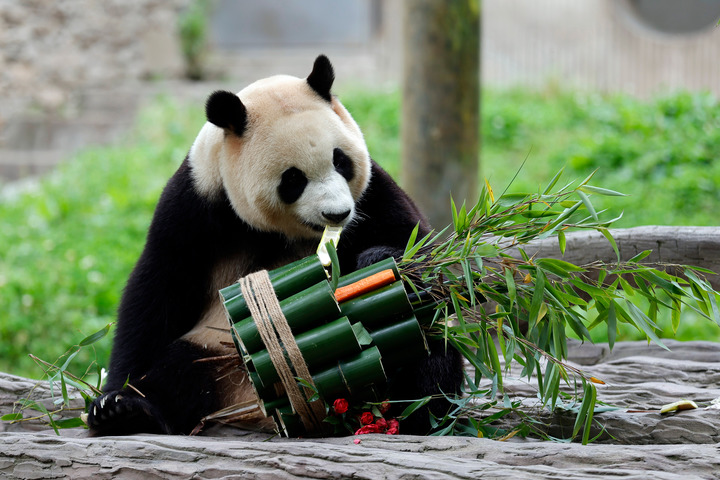 6月12日,大熊貓“福寶”在中國(guó)大熊貓保護(hù)研究中心臥龍神樹坪基地的圈舍進(jìn)食。新華社記者 沈伯韓 攝