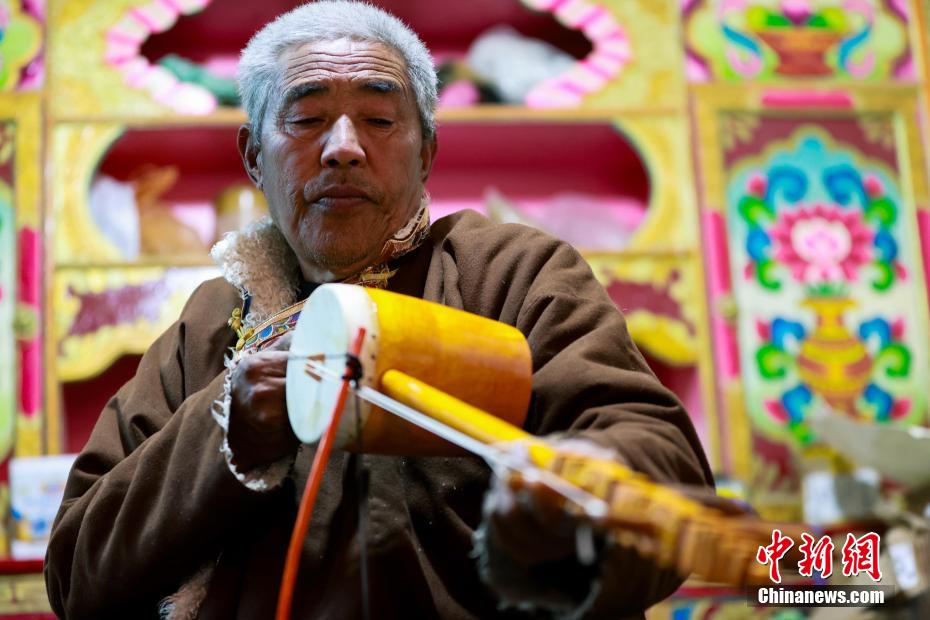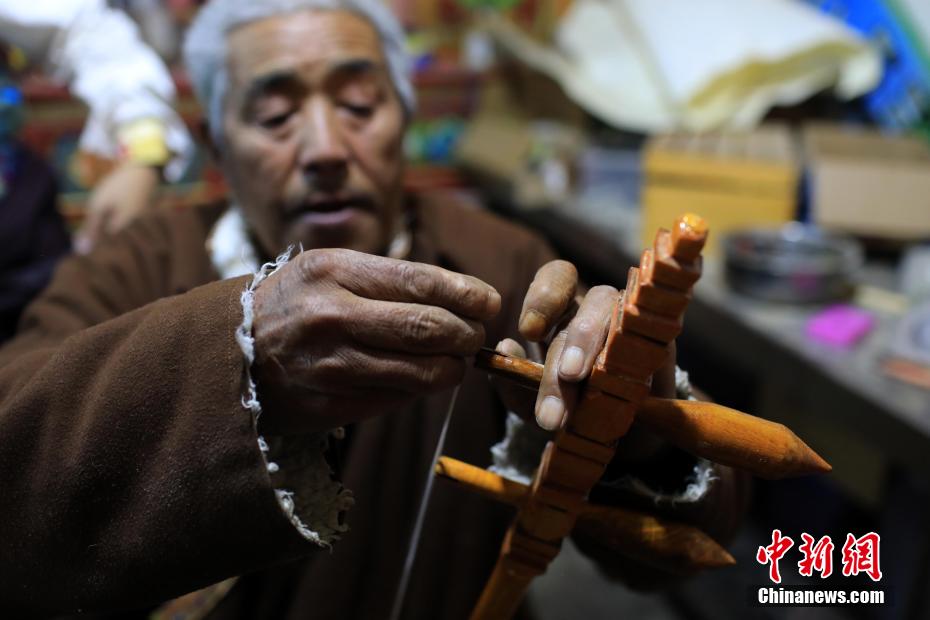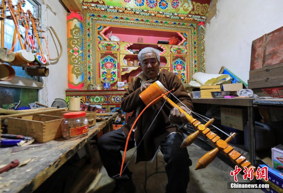 12月21日,四川巴塘,在弦胡制作坊里,王扎西為新制作的弦胡上琴弦。中新社記者 薛蒂 攝