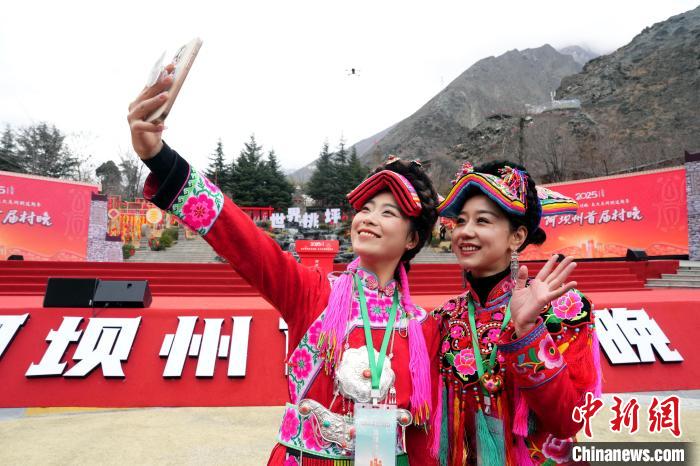 1月25日,四川理縣,當?shù)孛癖娭褡宸椩诖逋憩F(xiàn)場合影留念。中新社記者 安源 攝
