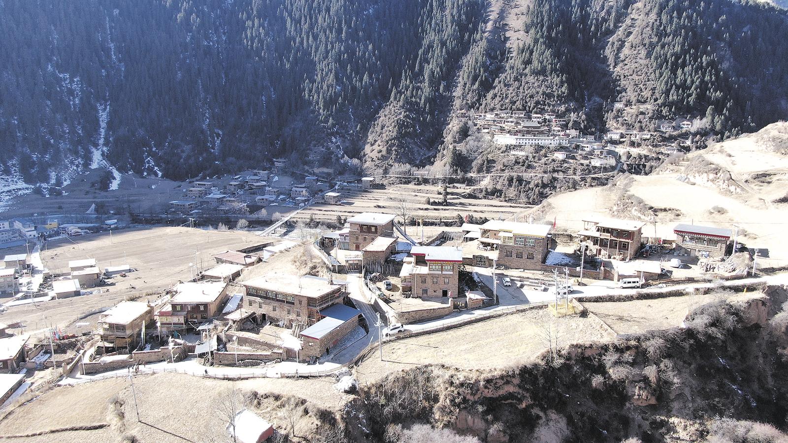 1月13日,記者從班瑪縣出發(fā),沿著蜿蜒的瑪珂河一路南下,來到了“中國保存最完好的藏式碉樓群落之一”的班瑪縣燈塔鄉(xiāng)班前村。走進(jìn)班前村,只見四面群山環(huán)繞,不遠(yuǎn)處,結(jié)著冰的瑪珂河像一條白絲帶,在陽光的照耀下格外耀眼。依山傍水的班前村地勢(shì)起伏較大,行走其間多半為上坡路,不一會(huì)兒,記者來到一處相對(duì)平坦的房屋前,上面掛著的匾額上赫然寫著“中國傳統(tǒng)村落——班前村”。