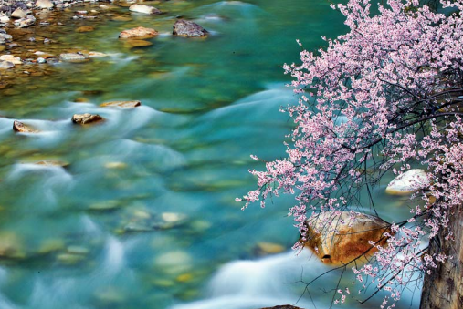 察隅河谷綻放的花與溪流(4月7日拍攝)。 本報記者黃豁攝