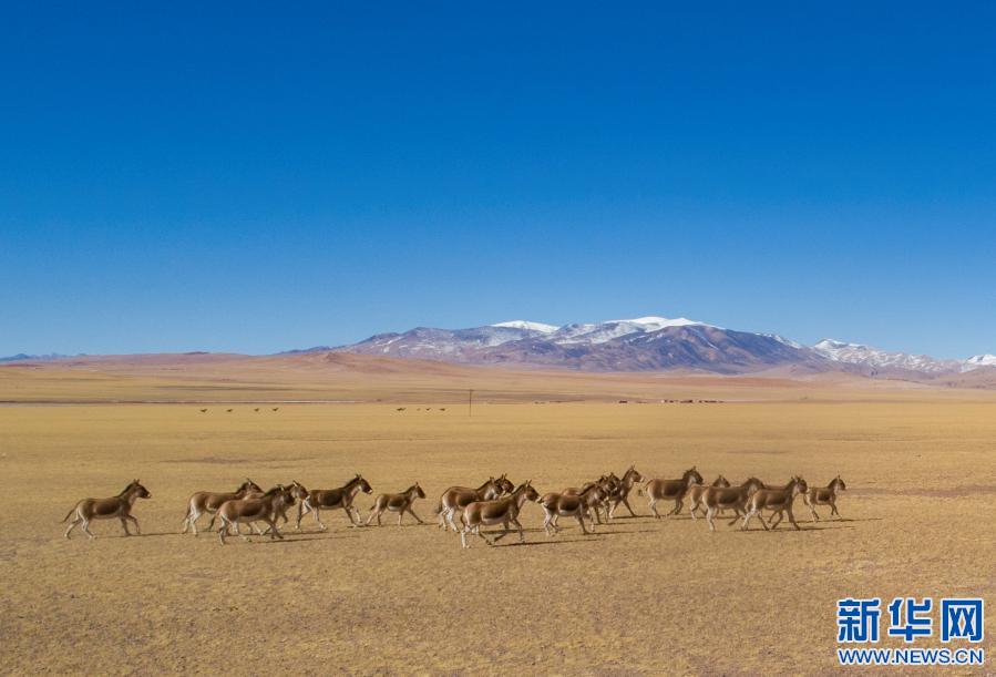 在西藏羌塘國(guó)家級(jí)自然保護(hù)區(qū)拍攝的一群奔跑的藏野驢(2019年12月23日攝,無(wú)人機(jī)照片)。新華社記者 孫非 攝