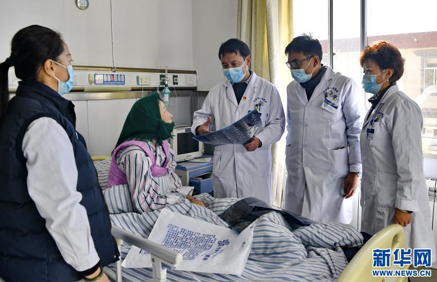 在拉薩市人民醫(yī)院病房,拉薩市人民醫(yī)院副院長妮瑪(左一)和主治醫(yī)師扎西云旦(中)、外科主任平措(右二)、醫(yī)務(wù)部主任德央(右一)做術(shù)前討論(2020年12月31日攝)。新華社記者 張汝鋒 攝
