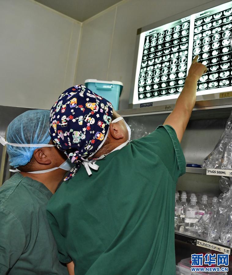 在拉薩市人民醫(yī)院第二手術(shù)室,兩位醫(yī)生在術(shù)前仔細觀察包蟲病患者的CT檢查圖像(2020年12月31日攝)。新華社記者 張汝鋒 攝