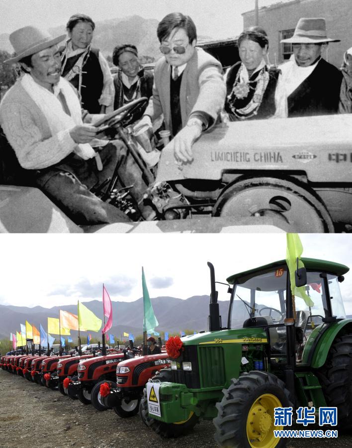 拼版照片:上圖是1996年,山東省援助西藏的首批農(nóng)機(jī)物資日前抵達(dá)日喀則。圖為山東援藏干部在給當(dāng)?shù)夭刈遛r(nóng)民講解農(nóng)機(jī)具的使用方法(新華社記者 土登 攝);下圖是2012年5月4日,西藏日喀則市白朗縣成為西藏自治區(qū)第一個(gè)農(nóng)業(yè)機(jī)械化示范縣。圖為停放在白朗縣田間的農(nóng)業(yè)機(jī)械(新華社記者 多吉占堆 攝)。新華社發(fā)
