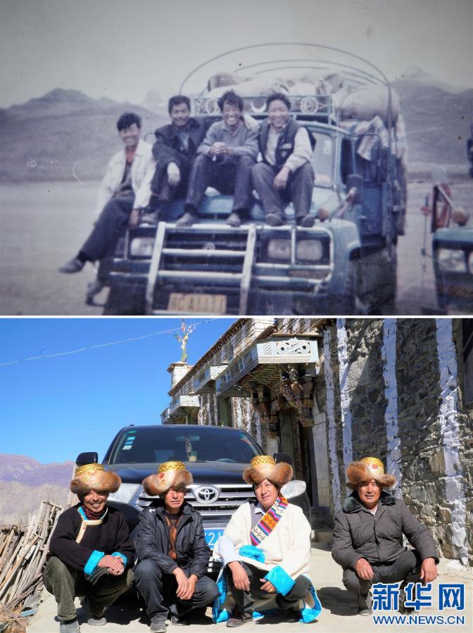 拼版照片:上圖:1994年,24歲的強巴(右二)和他的三個兄弟在西藏阿里地區(qū)跑運輸時,在自己購買的“東風”牌運輸車前合影(強巴提供)。(新華社發(fā))