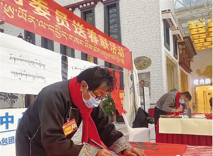 “這次我和各位書法家集聚于此,為委員們題寫春聯(lián)和書法作品,深感榮幸,這不僅進(jìn)一步弘揚了傳統(tǒng)文化,更為大家送上了新春祝福,表達(dá)了美好的新年愿景,也希望我們書寫的作品通過各位委員傳遞到廣大群眾中,弘揚主旋律、傳遞正能量,切實發(fā)揮文藝激勵人心的作用?!敝袊鴷覅f(xié)會會員、中國美術(shù)家協(xié)會會員、自治區(qū)書法家協(xié)會副主席、拉薩市書法家協(xié)會主席高延鴻說。