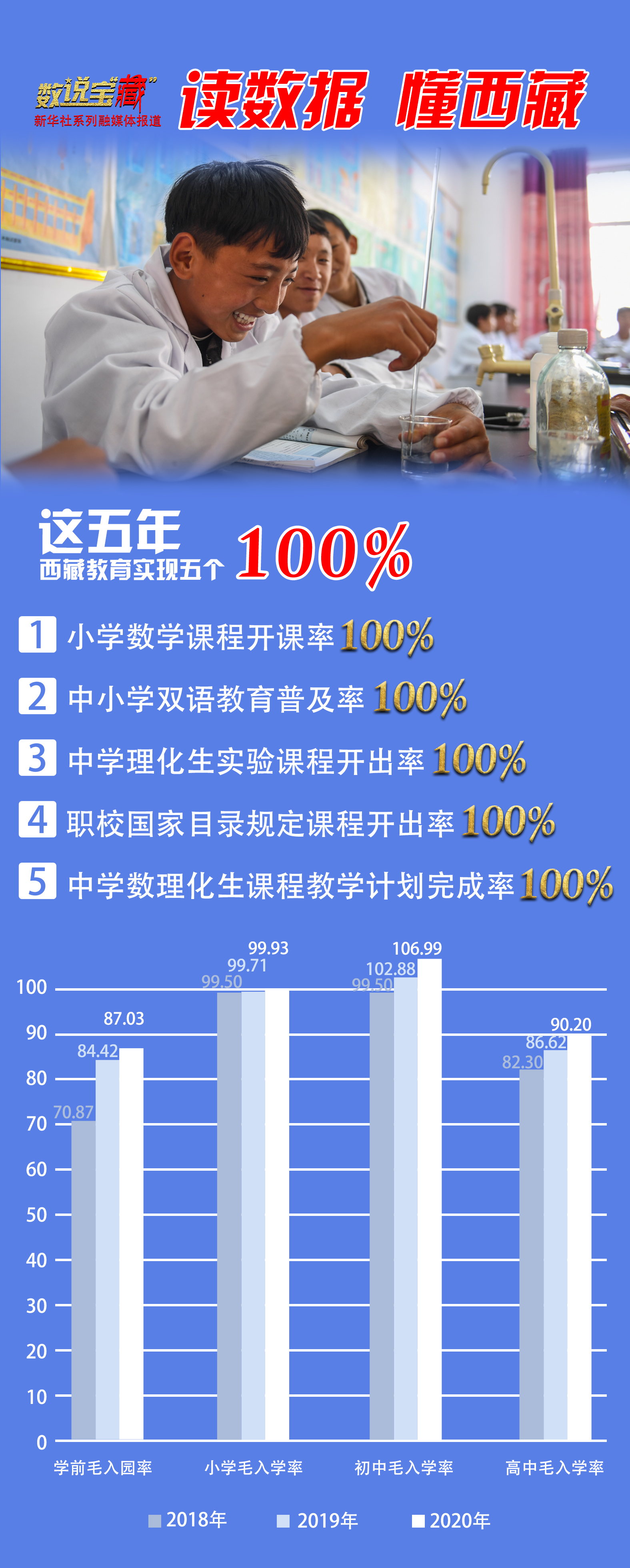 西藏自治區(qū)教育廳公布的數(shù)據(jù)顯示:“十三五”時(shí)期,西藏教育“五個(gè)100%”全面實(shí)現(xiàn),即中小學(xué)雙語(yǔ)教育普及率100%,小學(xué)數(shù)學(xué)課程開(kāi)課率100%,中學(xué)數(shù)理化生課程教學(xué)計(jì)劃完成率100%,中學(xué)理化生實(shí)驗(yàn)課程開(kāi)出率100%,職業(yè)技術(shù)學(xué)校國(guó)家目錄規(guī)定課程開(kāi)出率100%。