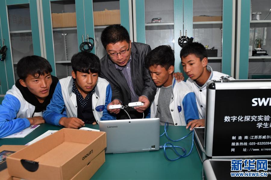 在西藏日喀則市第一高級(jí)中學(xué),來(lái)自山東省煙臺(tái)市海陽(yáng)四中的物理老師魯旭(中)在指導(dǎo)高三學(xué)生進(jìn)行物理課分組實(shí)驗(yàn)(2017年8月23日攝)。新華社記者 張汝鋒 攝