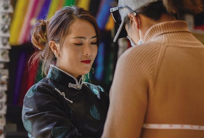 “老板,你家還有這款藏裝嗎?我想要一款?!痹谠摰陜?nèi),市民卓嘎拿出手機(jī),指著格桑措姆錄制的藏裝短視頻說(shuō)道?!坝械?,這是我們今年推出的新款,是對(duì)傳統(tǒng)的藏裝進(jìn)行了改良,主要是體現(xiàn)在領(lǐng)口處,改良后的藏裝對(duì)領(lǐng)口部位進(jìn)行了復(fù)古簡(jiǎn)約化設(shè)計(jì),使其兼具美觀性與舒適性,再搭配一個(gè)‘卡烏’堪稱完美?!备裆4肽方榻B道。