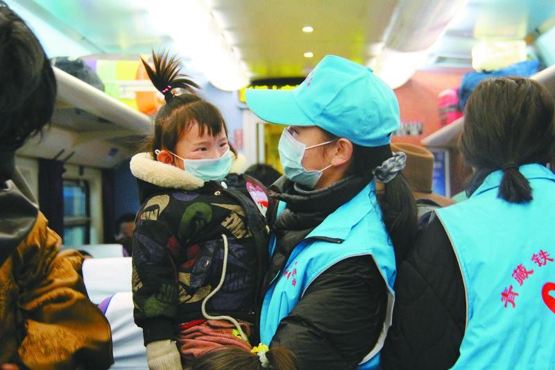 圖為拉薩火車(chē)站的志愿者在列車(chē)上為小旅客服務(wù)。